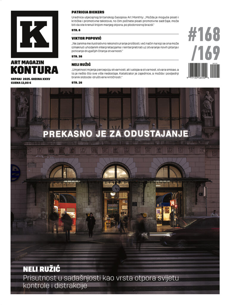 S pozicije urednice odlazim pred još jednom uređenom Konturom, čiji predmet sadržaja odražava koliko umjetnost otvara prostor za suštinska pitanja, kako se probija i u nezahvalnim vremenima. Prije svega, radujem se što u ovome broju možete čitati opsežan razgovor s Patricijom Bickers, istaknutom britanskom kritičarkom koja je otvoreno podijelila svoje iskustvo dugogodišnjeg vođenja i uređivanja utjecajnog časopisa za kritiku, Art Monthly magazina, ali i svoje uvide u problematiku kritičkog pisanja, poučavanja i percipiranja povijesti i novije umjetnosti. Ona upućuje na razne fenomene pa i da „taj osjećaj frustracije i potrebe da se viče, pokazuje koliko je danas teže umjetnicima doprijeti do publike“. Bickers se u razgovoru stoga pita „bi li radikalni umjetnik poput Mladena Stilinovića danas uopće dobio ikakvu pažnju“. Tu su i inspirativni razgovori s umjetnicima, Viktorom Popovićem i Neli Ružić.